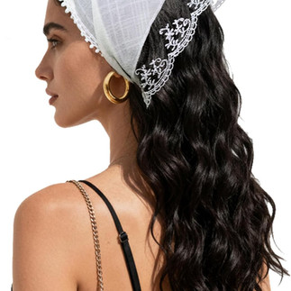This farmer’s market look is soft, feminine coastal perfection — a white lacey blouse paired with a denim mini for that easy, breezy charm. The adorable white lace bandana adds the sweetest touch, while the yellow‑tan high boots bring in that warm, sun‑kissed vibe.